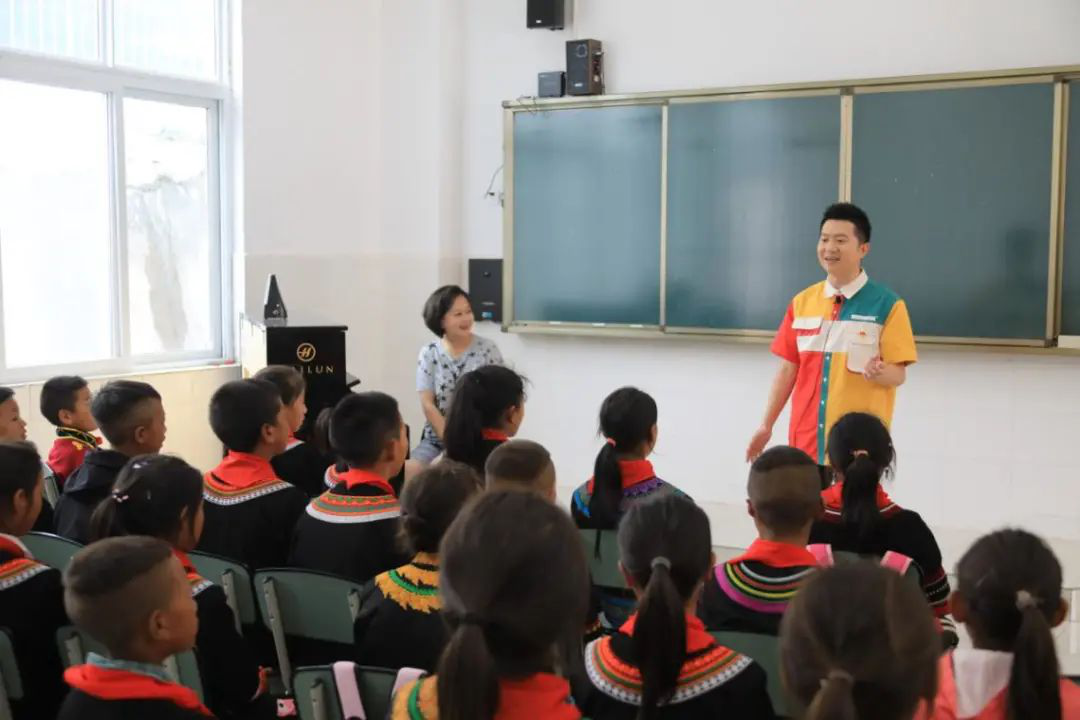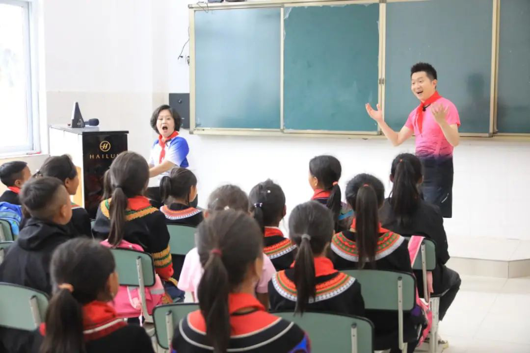 在運動比賽結束后,央視少兒頻道的“主持人天團”也變身課外輔導員,為魯基鄉文翰小學的學生們輔導語文、英語、音樂等課程。