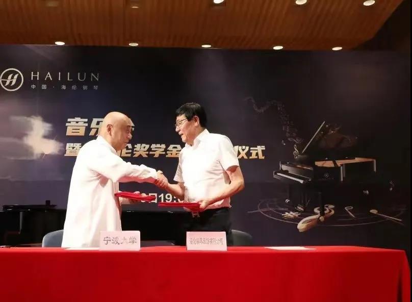 寧波大學音樂學院俞子正先生與海倫鋼琴股份有限公司董事長陳海倫先生簽訂捐贈協議,由寧波大學副校長趙全軍先生向海倫鋼琴股份有限公司董事長陳海倫先生頒發捐贈證書。