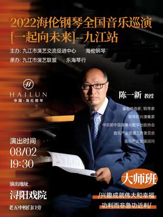 8月2日晚,由海倫鋼琴、九江市演藝交流促進中心主辦,九江市演藝聯盟,樂海琴行承辦的“2022海倫鋼琴全國巡演陳一新教授大師班”在潯陽戲院正式開講。